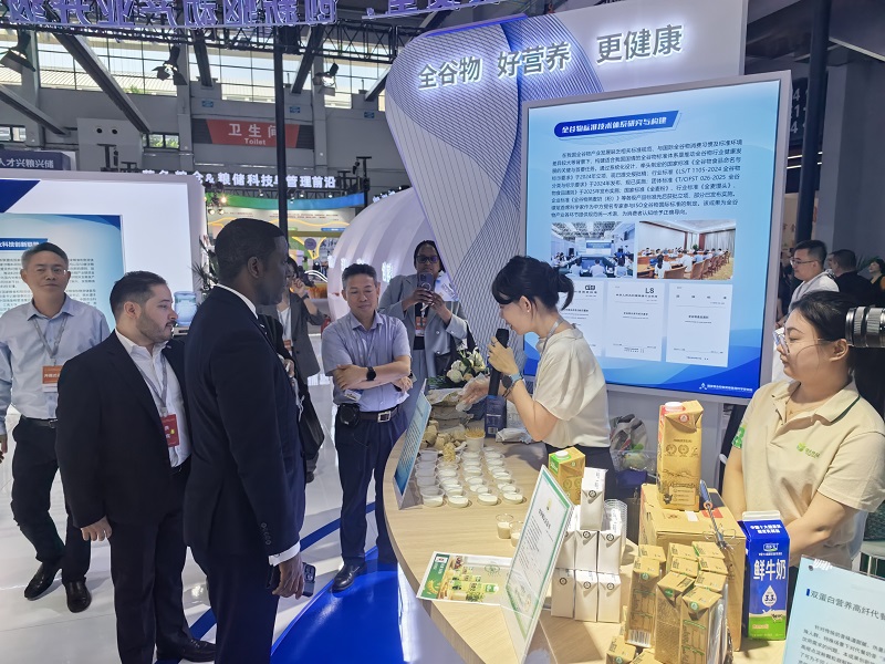 在這場聚焦糧食安全與(yu) 產(chan) 業(ye) 發展的盛事中,amjs澳金沙门食品聯合國家糧食和物資儲(chu) 備局科學研究院(國糧院),在研究院展區設立“全穀物營養(yang) 健康食品主題展區”,雙方共同研發的全國首款全穀物燕麥奶作為(wei) 核心創新產(chan) 品驚豔亮相,工作人員現場為(wei) 觀眾(zhong) 深入普及全穀物健康知識,成為(wei) 全場焦點。